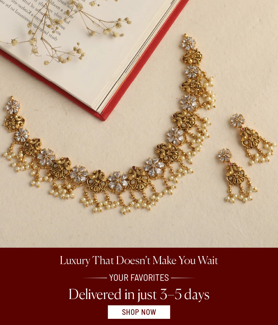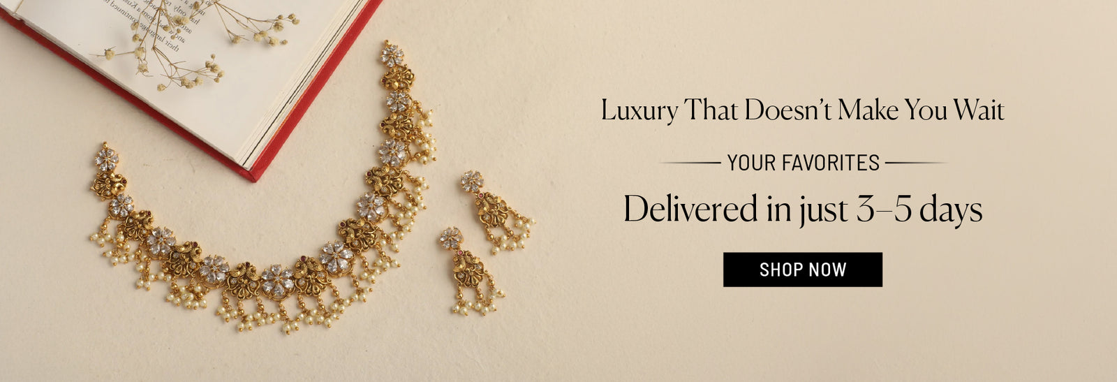 Our jewellery designers and artisan craftsmen spend hundreds of hours every month to bring you original, unique, and classical designs in earrings, necklace sets, chokers, and more.