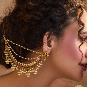 Adorned with white, red, and green stones, the Chintamani Antique Ear Chain showcases intricate craftsmanship with antique gold plating. A perfect pick to add elegance and tradition to festive and bridal looks.
