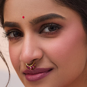 Adorned with a radiant red stone and finished in antique gold plating, the Kshirja nose pin is a delicate masterpiece of traditional craftsmanship. Its intricate design celebrates heritage and adds a graceful charm, making it a cherished adornment for women who love timeless elegance and festive beauty.