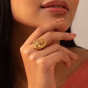 The Mouli Antique Finger Ring is adorned with an intricately carved elephant motif in antique gold plating. A symbol of strength and wisdom, this heritage-inspired design is a unique choice for cultural occasions and celebrations.