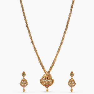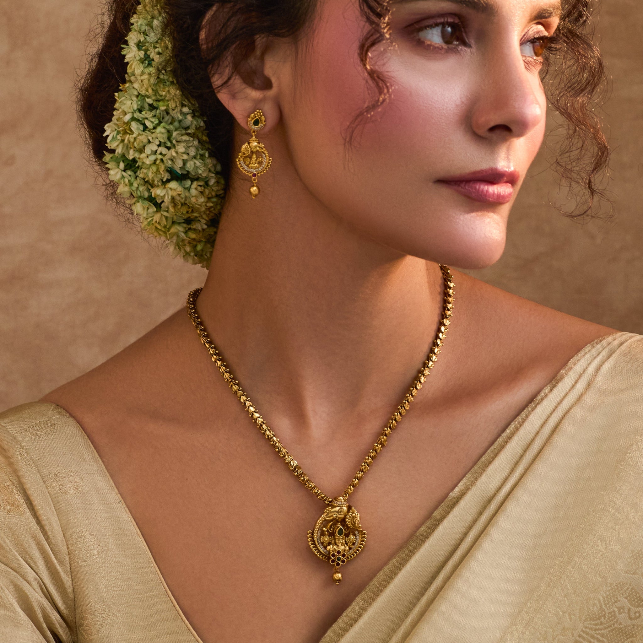 The Kriti Antique Pendant Set is adorned with radiant kempu stones and finished in antique gold plating. Rich in symbolism and heritage, this elegant pendant is a striking choice for festivals, religious ceremonies, and traditional gatherings.