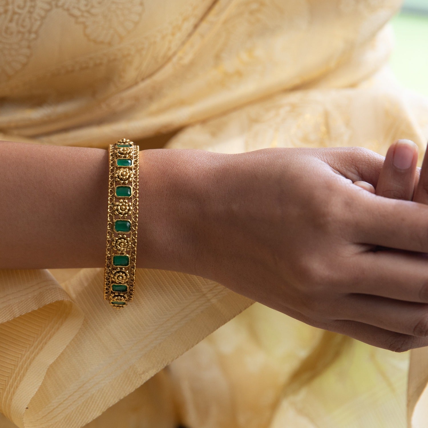 Antique bangles and bracelets for women can be easily worn instead of real gold bangles without diminishing your appearance. They are made of brass plated with gold or oxidized silver or can be two-toned, depending on the design. Antique bangles can be worn every day or for special events. The common motifs on these bangles and bracelets are temple, tribal, flora, and fauna. You can go for delicate antique bangles for a minimalistic look. Heavy antique bangles and bracelets can be worn alone or with other plain thin bangles to create a stack. The stacked bangle look is very popular with Indian brides and is a must for the wedding trousseau. The Arha Antique Bangles are one of our favorite antique bangles amongst the many designs at Tarinika.