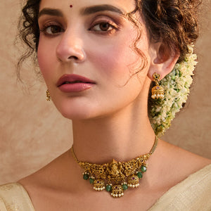An elegant antique choker set adorned with red and green stones, finished with delicate green beads. Featuring the divine Dhanalaxmi at the center, it symbolizes prosperity and love, making it a perfect choice for weddings and festive occasions.