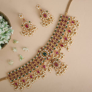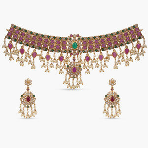Iravya Antique Choker Set is crafted with white, red, and green CZ stones in antique gold plating. Blending tradition with elegance, this choker is perfect for weddings, festive occasions, and cultural celebrations. A timeless treasure for women who love heritage jewelry.