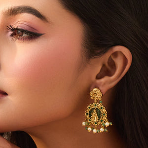 The Muralika antique drop earrings showcase exquisite craftsmanship with a divine Krishna-inspired design and delicate floral motif. Adorned with green stones and finished in antique gold plating, they bring timeless elegance and heritage charm to every occasion.