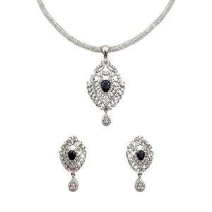 Accented with black stones and delicate CZ detailing, this pendant set is finished in elegant white rhodium plating. Works well with a midi dress, or a soft cotton kurta.