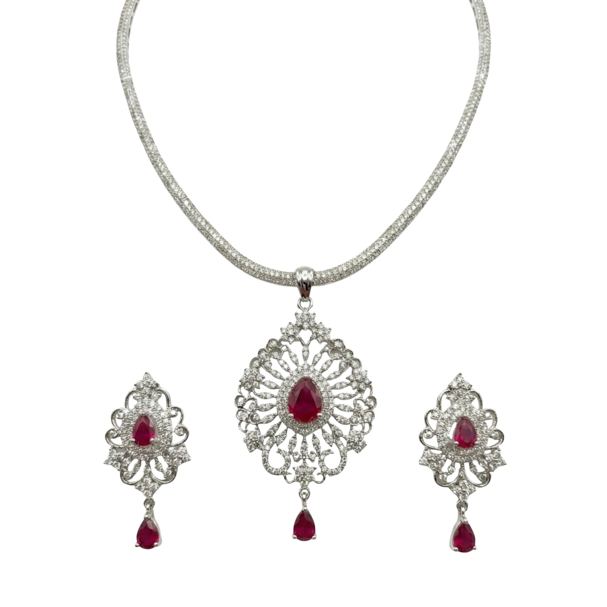 This pendant set is inspired by the elegance of the peacock, highlighted with CZ accents. Wear it with a silk kurta, a brocase blouse with a plain saree, or a traditional saree.