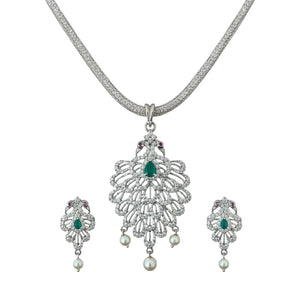 Intricately detailed with a luminous green center stone, this peacock feather pendant stands out beautifully. Style it with a silk kurta set or a satin skirt and fine-knit jumper for evening plans.