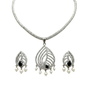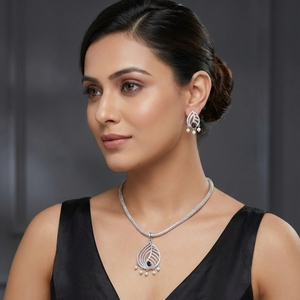 This pendant set is inspired by fine detailing and classic symmetry, accented with CZ stones. Pair it with a structured blouse, an anarkali, or a monochrome kurta set.