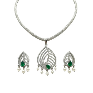 This pendant set is inspired by fine detailing and classic symmetry, accented with CZ stones. Pair it with a structured blouse, an anarkali, or a monochrome kurta set.
