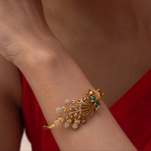 An elegant antique bracelet with peacock and garden motifs, highlighted by white and green stones. Perfect for adding a traditional charm to any occasion.