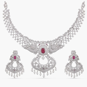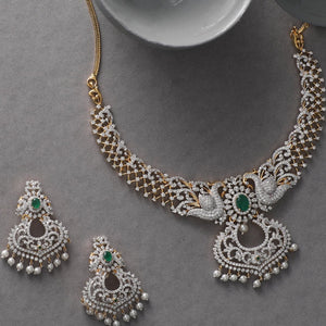 Getting ready for that special occasion? This Afrin Nakshatra necklace set is designed with bird motifs to leave a long-lasting impression. Studded with high-quality CZ stones, this jewelry is bold, beautiful, and rooted in the divine nature of the Indian culture.
