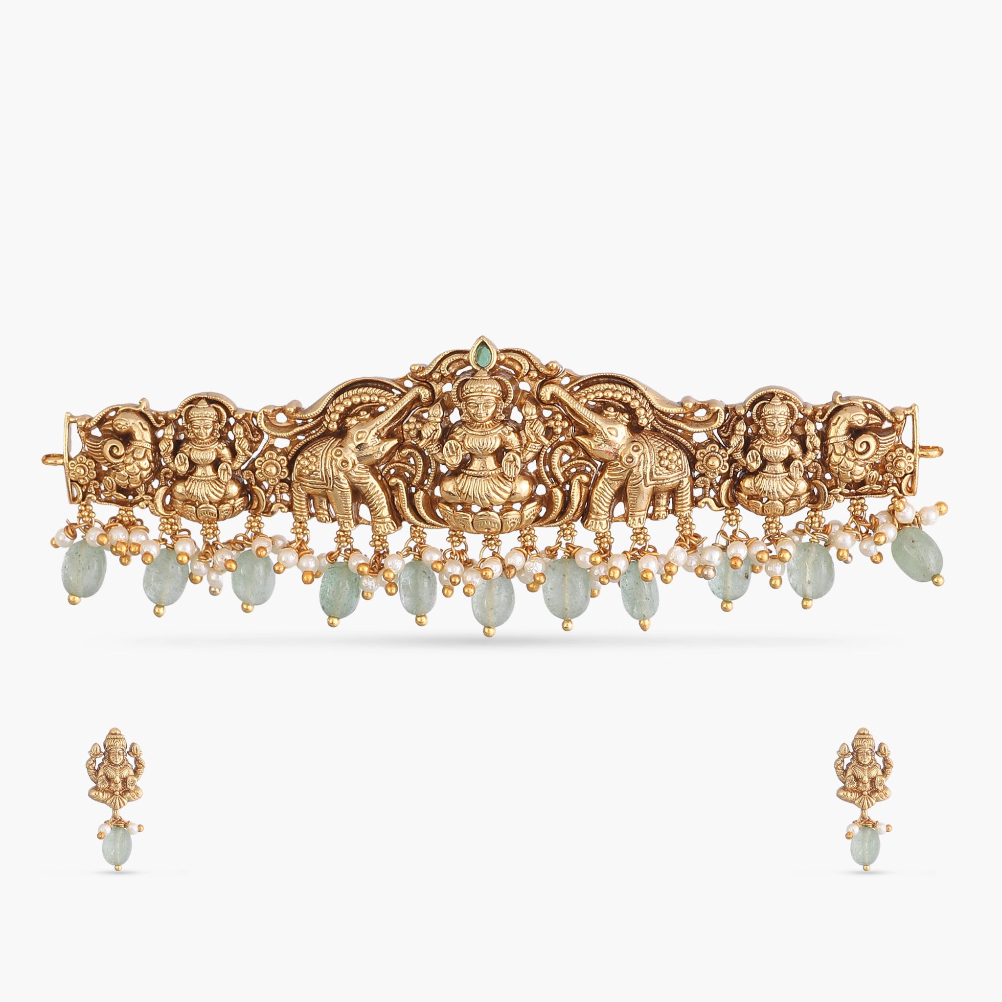 The Ishvika antique choker set showcases delicate craftsmanship, adorned with vibrant green stones and finished in antique gold plating. A timeless piece that adds a subtle touch of elegance and traditional charm to any ensemble.