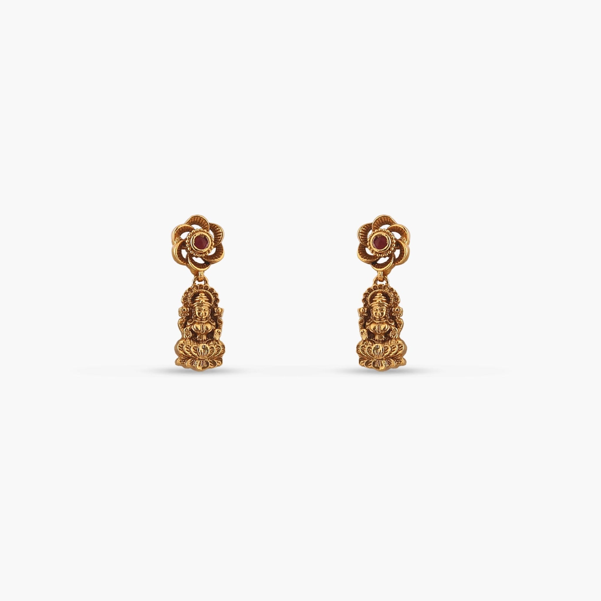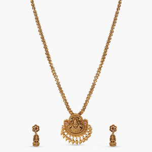 The Aarshika Antique Pendant Set is adorned with a divine Lakshmi motif, crafted in antique gold plating and enhanced with radiant red stones. Symbolizing grace and prosperity, this intricately designed set is an ideal pick for weddings, festive occasions, and traditional celebrations.