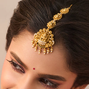 An exquisite antique maang tikka showcasing the goddess Lakshmi at the center, flanked by graceful peacock motifs and detailed with sparkling CZ stones. Rich in symbolism and artistry, this piece brings a regal finish to bridal and festive ensembles.