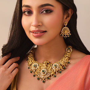 The Irita antique necklace set showcases exquisite craftsmanship with a divine Dhanya Lakshmi motif. Adorned with sparkling white and green stones and finished in antique gold plating, it brings a graceful touch of tradition and festive elegance to every occasion.