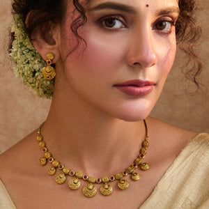 Symbolizing prosperity and divinity, this antique short necklace set features intricate Lakshmi motifs and coin-style detailing. Adorned with red kempu stones, it reflects the richness of temple jewelry traditions. A perfect choice for auspicious occasions, festivals, and bridal wear.