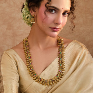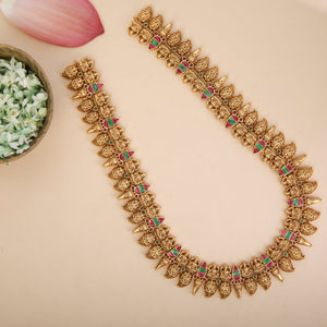Radiant red and green kempu stones come together with antique gold plating to create this striking long necklace. Designed with intricate craftsmanship and traditional elegance, it makes a perfect adornment for weddings, festive occasions, and grand celebrations.