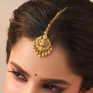 This antique maang tikka embodies the essence of tradition with its Lakshmi motif and detailed kempu stonework. Elegant and divine, it is designed to enhance bridal attire and festive wear, making it a treasured addition to your jewelry collection.