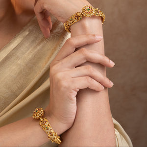 Teesta Antique Floral Bangles is crafted in timeless antique gold plating, highlighted with white, red, and green CZ stones. Designed with delicate flower motifs, this bangle blends tradition with elegance, making it perfect for weddings, festive wear, and special occasions. A graceful piece that women love to treasure in their jewelry collection.
