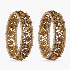 Make a stunning entrance with these exquisite bangles from Tarinika. This bangle set will elevate your style and charm your admirers featuring nakshi temple art with floral and leaf motifs. Crafted with high-quality CZ stones, adorned with gold wired pearls for a classic and elegant look.